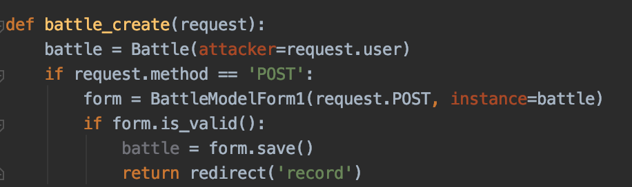 단 주의할 점은, 위에서도 말했듯이 instance를 미리 지정해 놓으면 해당 form은 그 객체에 대해서만 기능하는 폼이 된다. 따라서, 아래 코드에서 battle = form.save() 부분은 굳이 'battle =' 부분을 쓸 필요가 없다.
