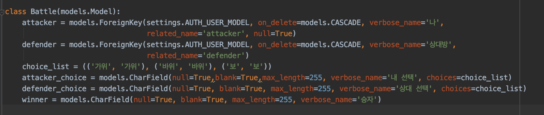 위의 Battle 모델은 attacker와 defender에 대해 각각 한번씩 User테이블을 참조하도록 FK지정해놓았으며, 게임 생성시에 몇가지의 필드를 받고 대응시에 몇가지의 필드를 받아야 하는 게임 특성 상 대부분의 필드에 null=True, blank=True 속성을 지정해놓았다.