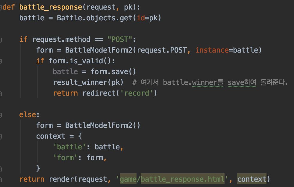 이제 문제는 battle_create 뷰 함수에서 만들어진 form객체가 어떻게 다른 함수인 battle_response 뷰 함수에서 사용될 수 있냐는 것인데, 이는 특정 Battle객체에 form의 내용을 넘겨줌으로써 해결했다.
